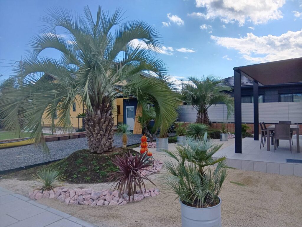 砂利や自然石、低木を組み合わせることで、南国らしい雰囲気を演出しつつ、全体のバランスにも配慮しています。